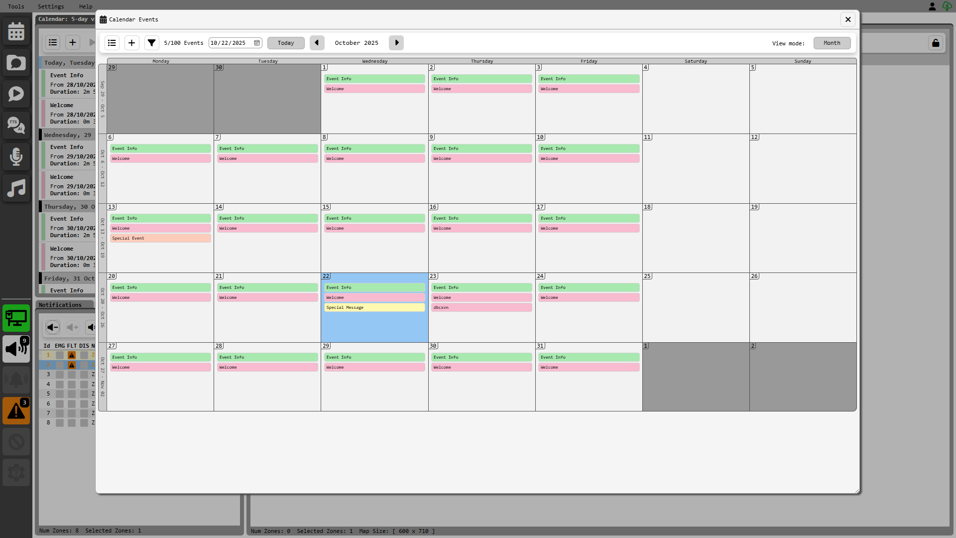 - Calendario: creazione di eventi per la riproduzione di messaggi preregistrati con programmazione temporale, gestione della codifica a colori degli eventi, fino a un massimo di 100 eventi programmati.
